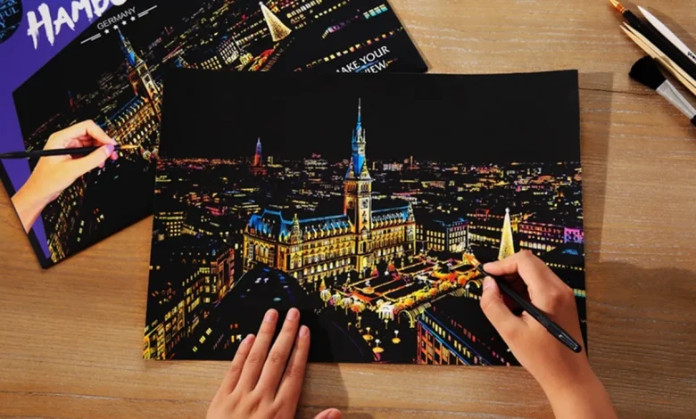 - نقاشیهای طرحدار (الگودار): محبوبترین نوع برای تازهکارها و بزرگسالان. در این نوع، خطوط کمرنگی از طرح نهایی (مانند مناظر شهری، طبیعت، حیوانات یا ماندالا) از قبل روی سطح مشکی مشخص شده است. شما باید خطوط را دنبال کرده و سطح را بخراشید. این نوع، برای کاهش استرس و تمرکز ایدهآل است. (مثال: اسکرچ کارتهای منظره لندن یا نیویورک).