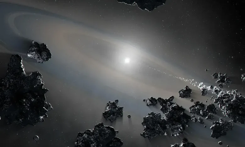 عکس کاور: طرحی گرافیکی از بقایای یک منظومهی سیارهای باستانی و مرده که به دور یک ستارهی کوتولهی سفید میچرخد. محاسبات جدید نشان میدهد که کوتولههای سفید و دیگر اجرام آسمانی با عمر طولانی، سریعتر از آنچه قبلا تصور میشد، در حال فروپاشی هستند.